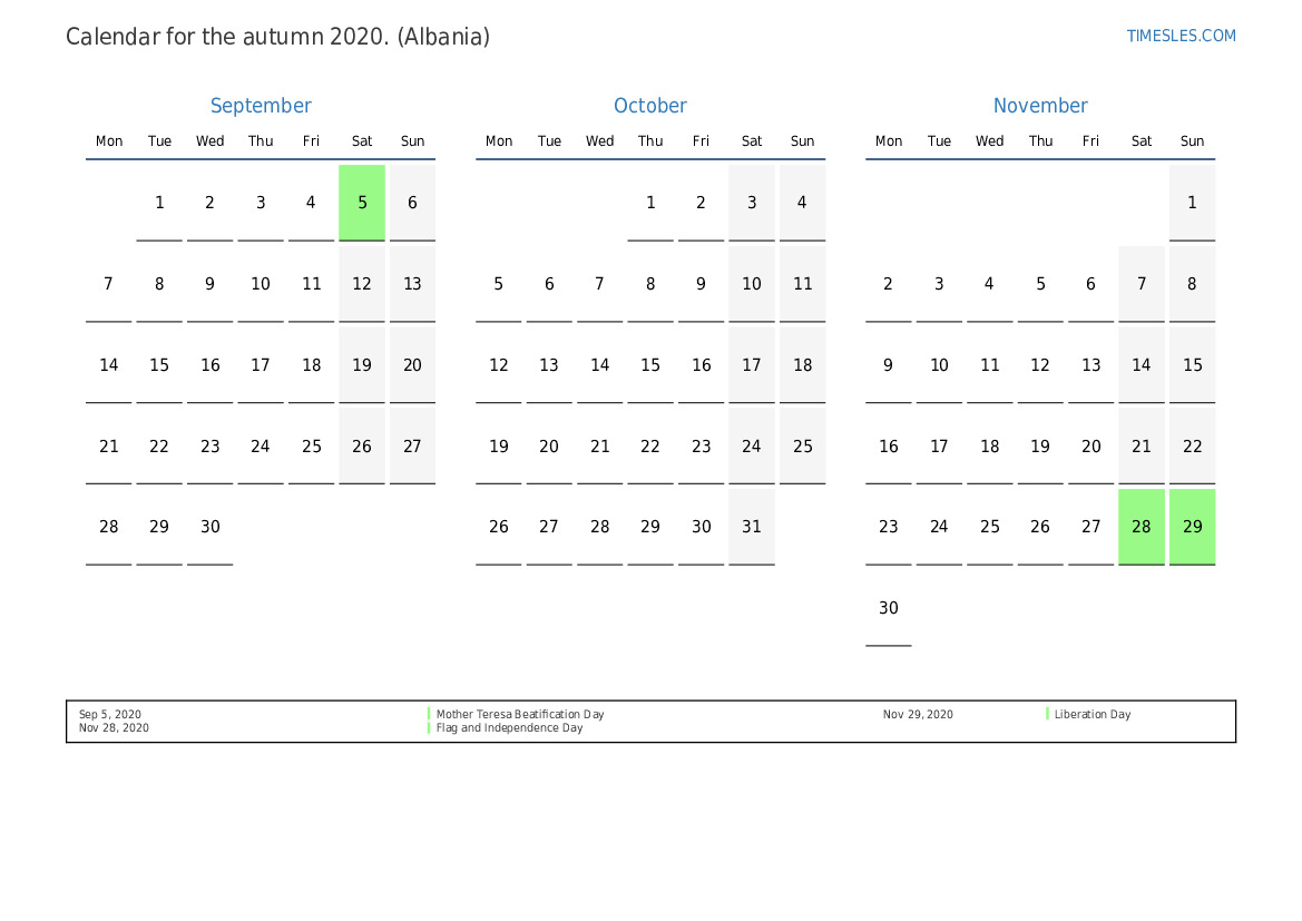 In the autumn of 2020, there are 6 holidays and days off in Albania. Autumn 2020 starts on Tuesday and ends on Monday.