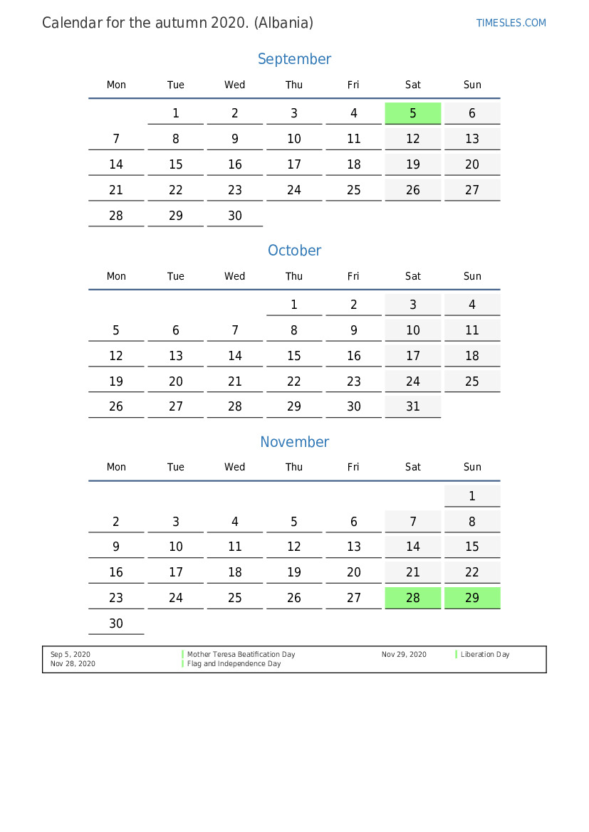 Download and print PDF calendar with holidays and weekends for the autumn of 2020 for Albania