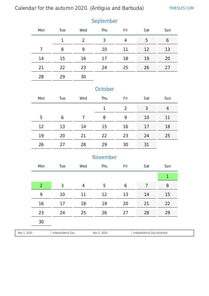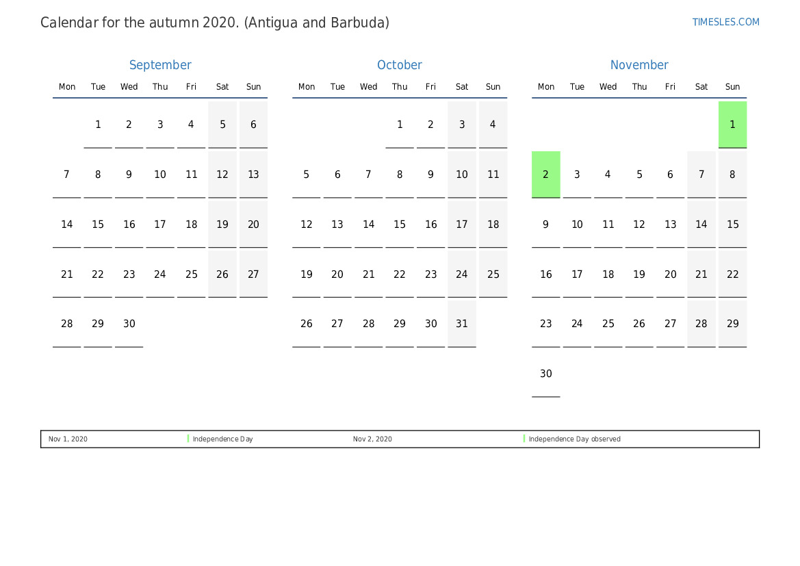Download and print PDF calendar with holidays and weekends for the autumn of 2020 for Antigua and Barbuda