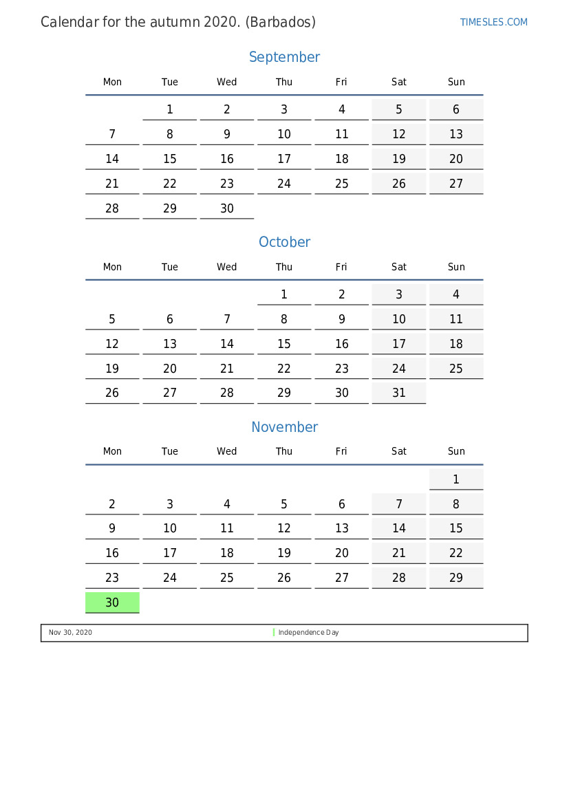 Download and print PDF calendar with holidays and weekends for the autumn of 2020 for Barbados