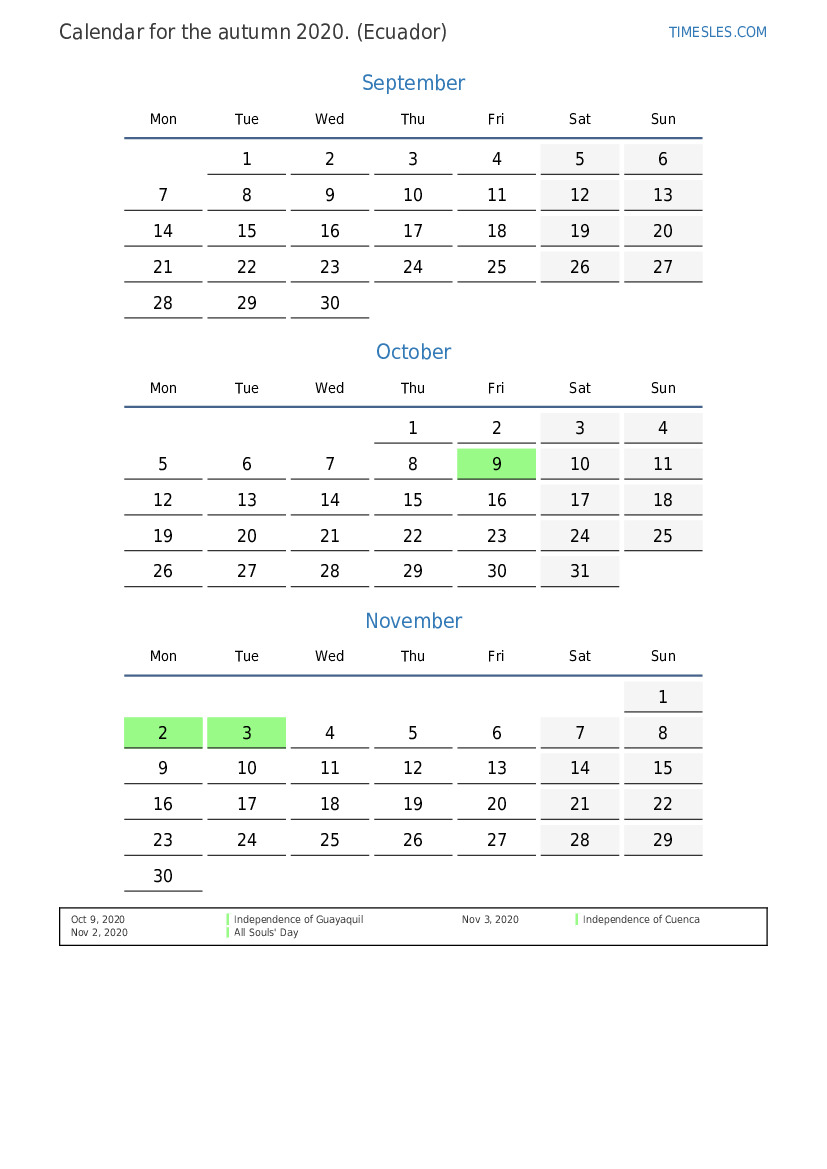 Download and print PDF calendar with holidays and weekends for the autumn of 2020 for Ecuador