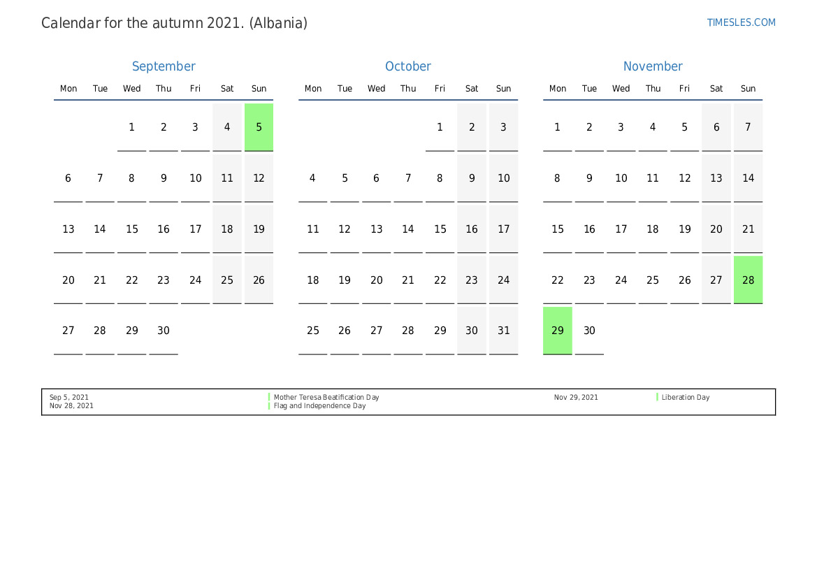 In the autumn of 2021, there are 6 holidays and days off in Albania. Autumn 2021 starts on Wednesday and ends on Tuesday.