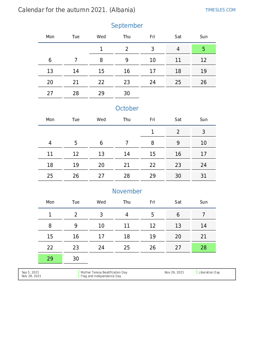Download and print PDF calendar with holidays and weekends for the autumn of 2021 for Albania