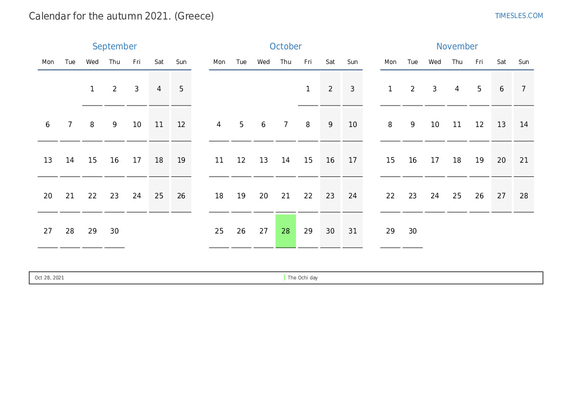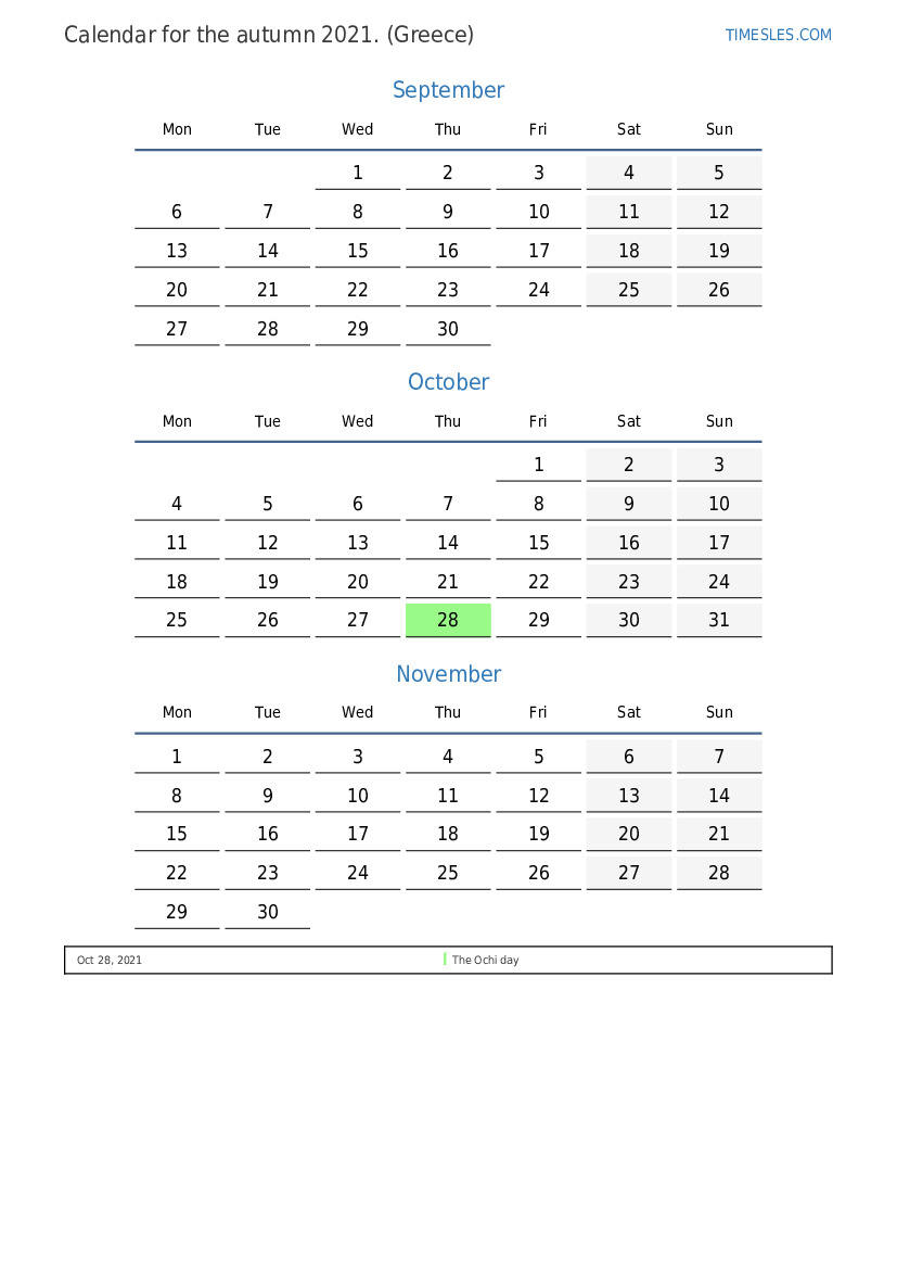 In the autumn of 2021, there are 4 holidays and days off in Greece. Autumn 2021 starts on Wednesday and ends on Tuesday.