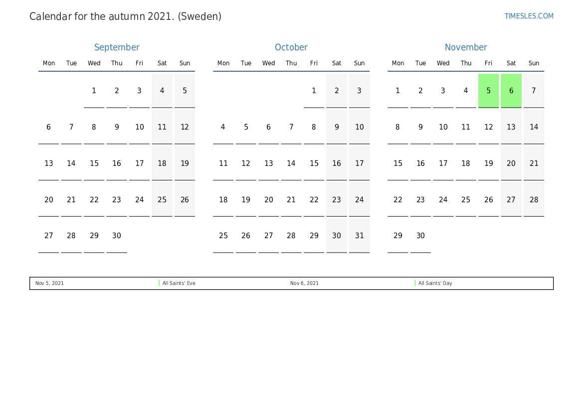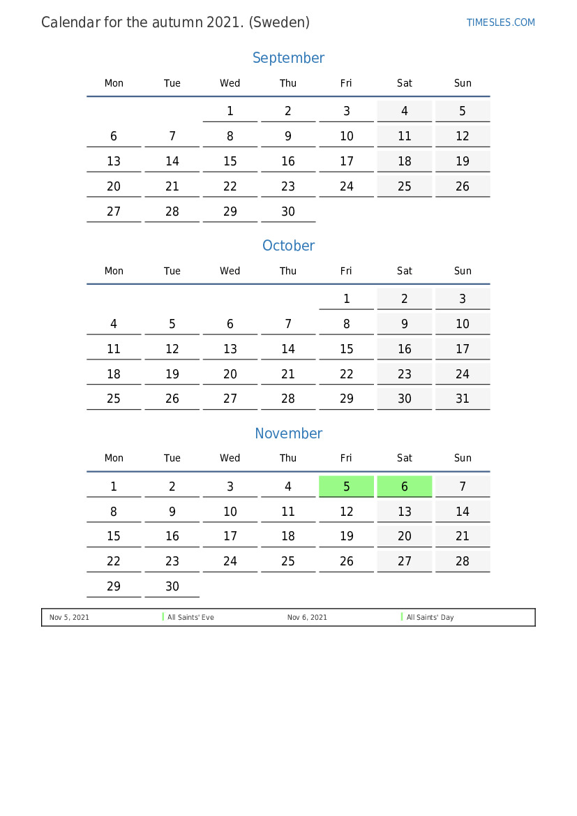 In the autumn of 2021, there are 6 holidays and days off in Sweden. Autumn 2021 starts on Wednesday and ends on Tuesday.