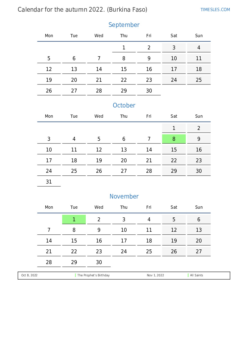 Download and print PDF calendar with holidays and weekends for the autumn of 2022 for Burkina Faso