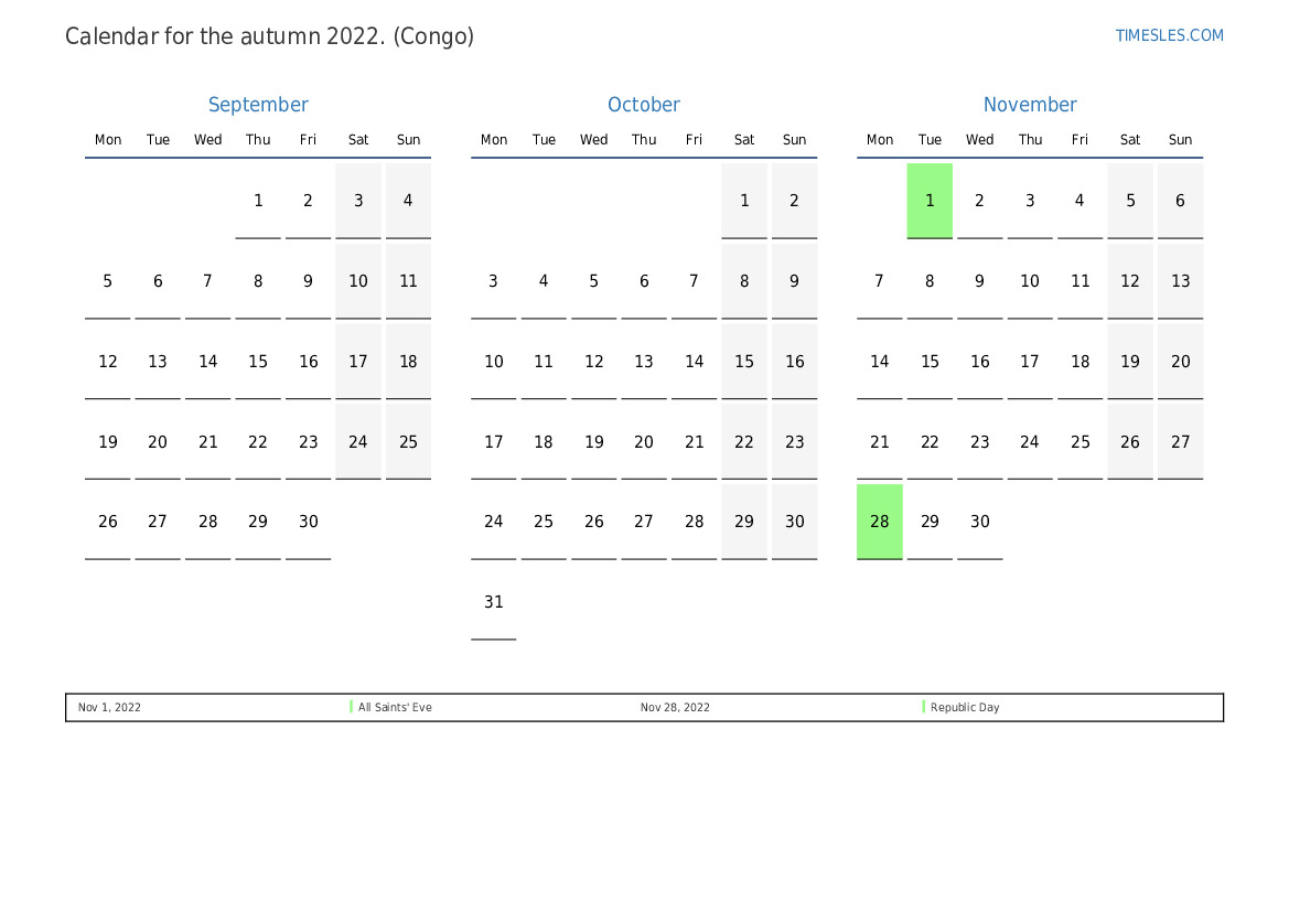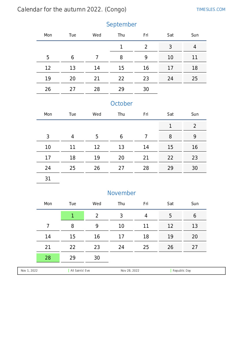 Download and print PDF calendar with holidays and weekends for the autumn of 2022 for Congo