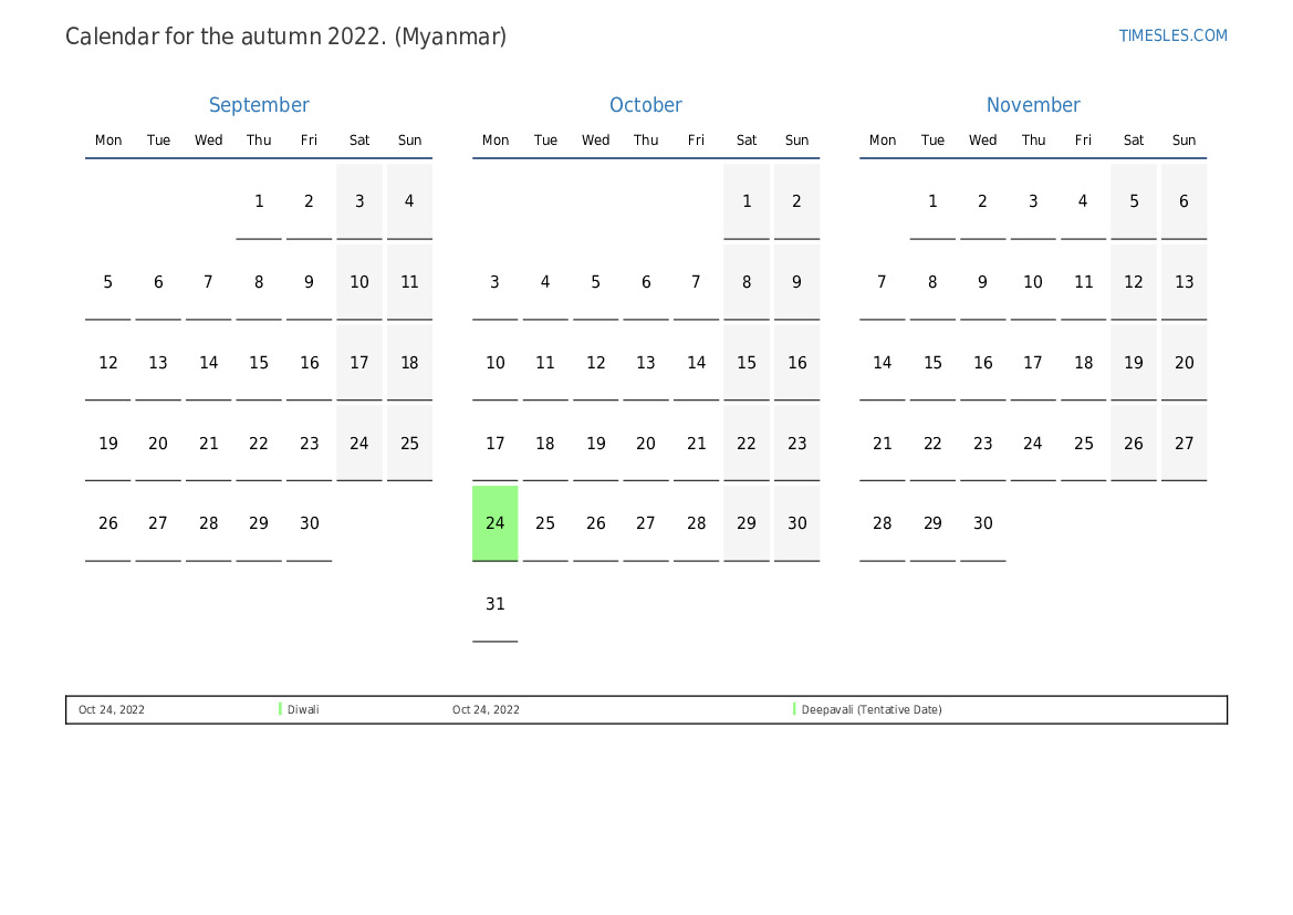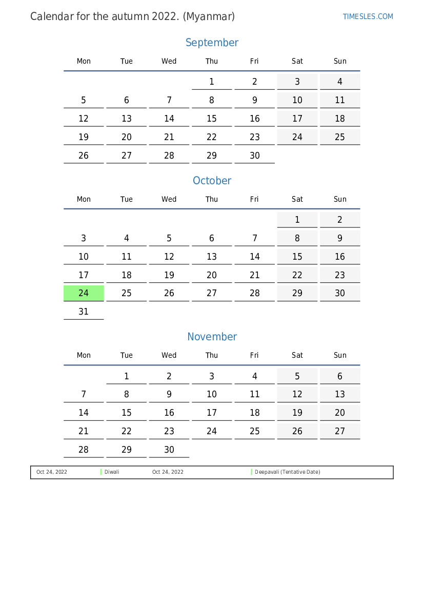 Download and print PDF calendar with holidays and weekends for the autumn of 2022 for Myanmar