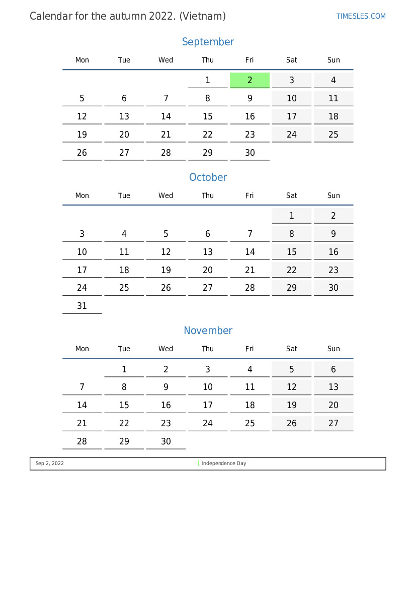 Download and print PDF calendar with holidays and weekends for the autumn of 2022 for Vietnam