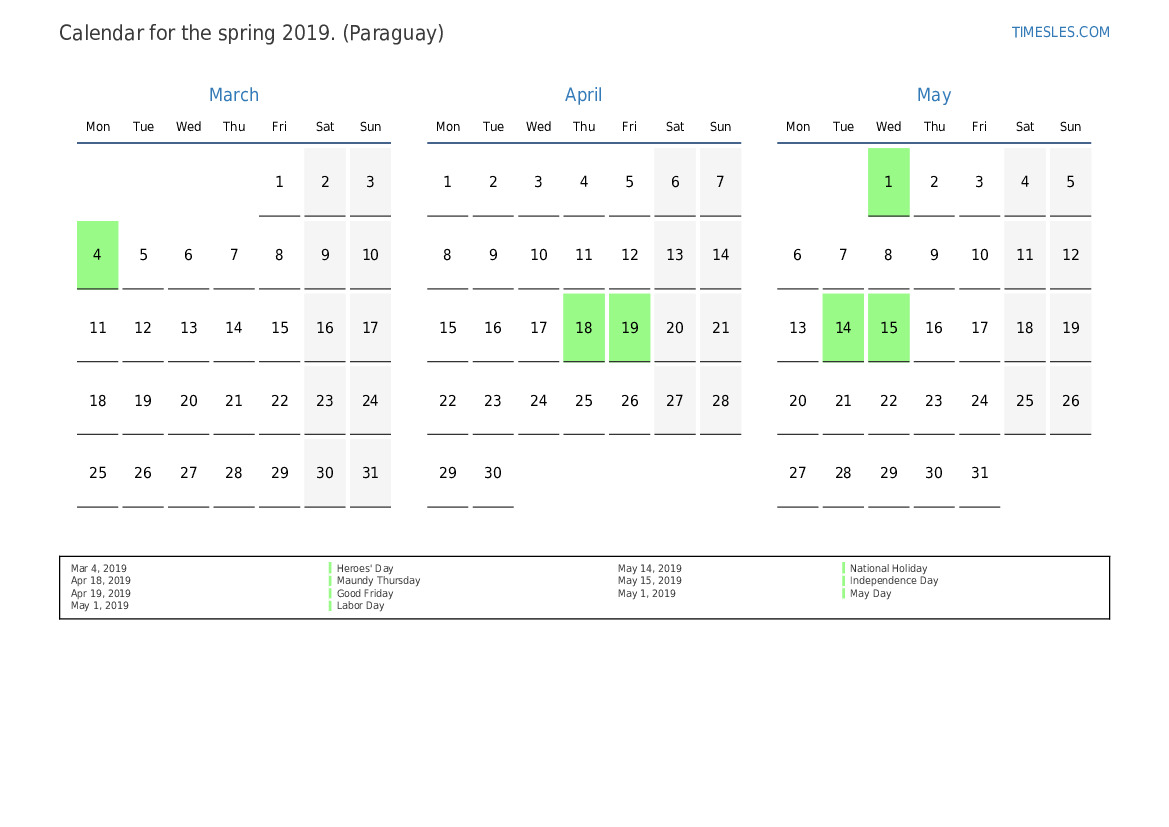 Download and print PDF calendar with holidays and weekends for the spring of 2019 for Paraguay