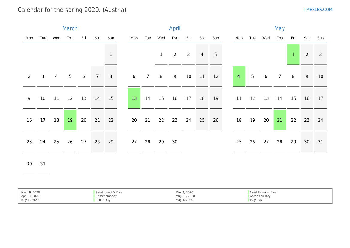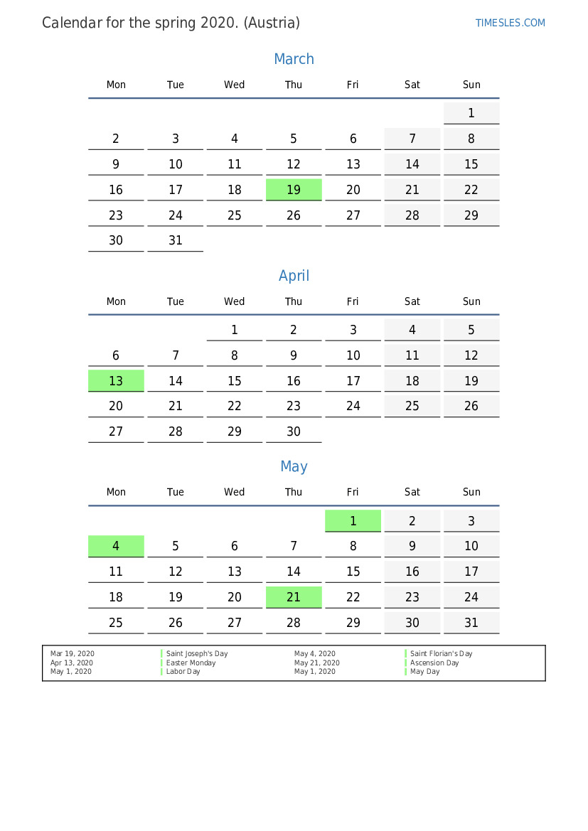 Download and print PDF calendar with holidays and weekends for the spring of 2020 for Austria