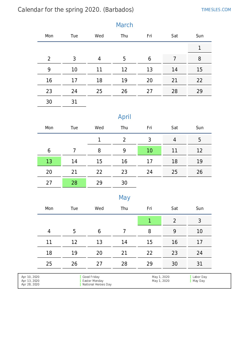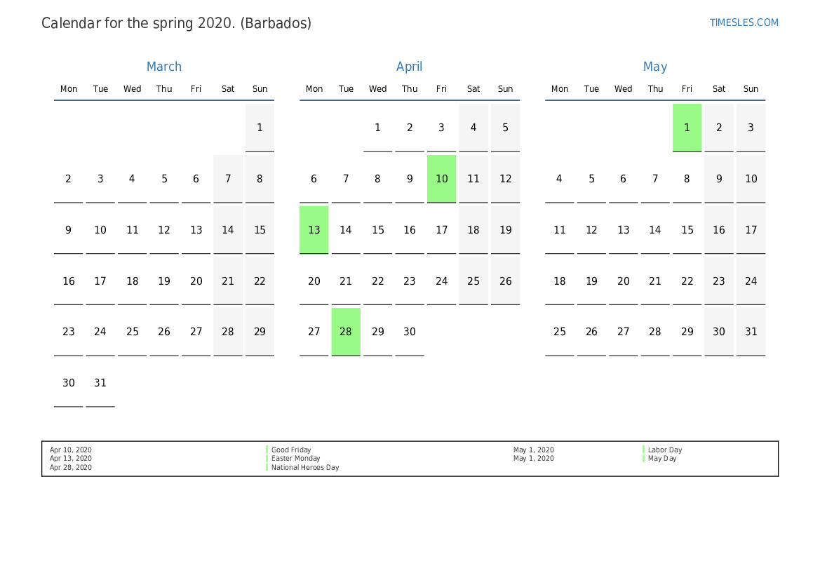Download and print PDF calendar with holidays and weekends for the spring of 2020 for Barbados