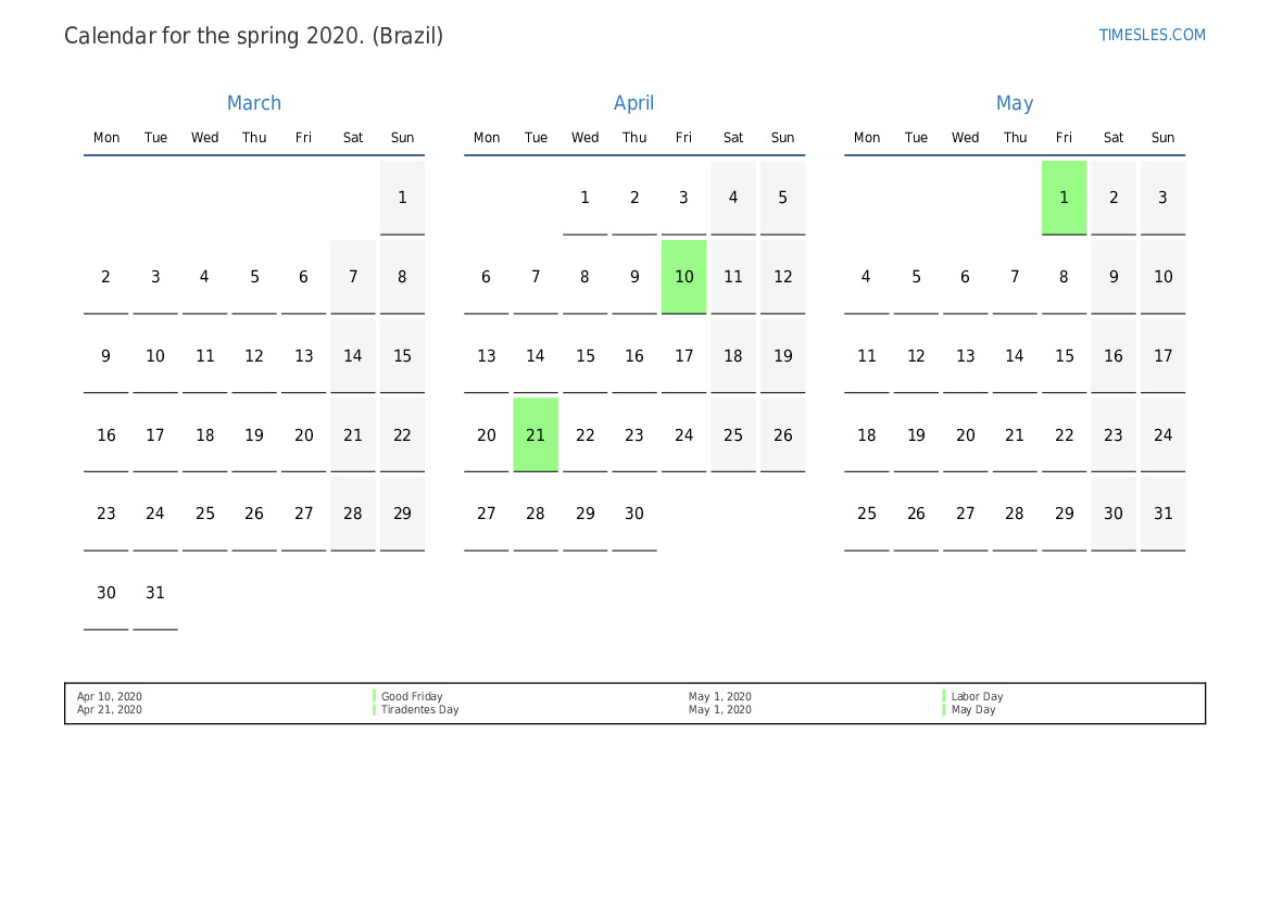 Download and print PDF calendar with holidays and weekends for the spring of 2020 for Brazil