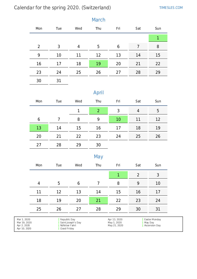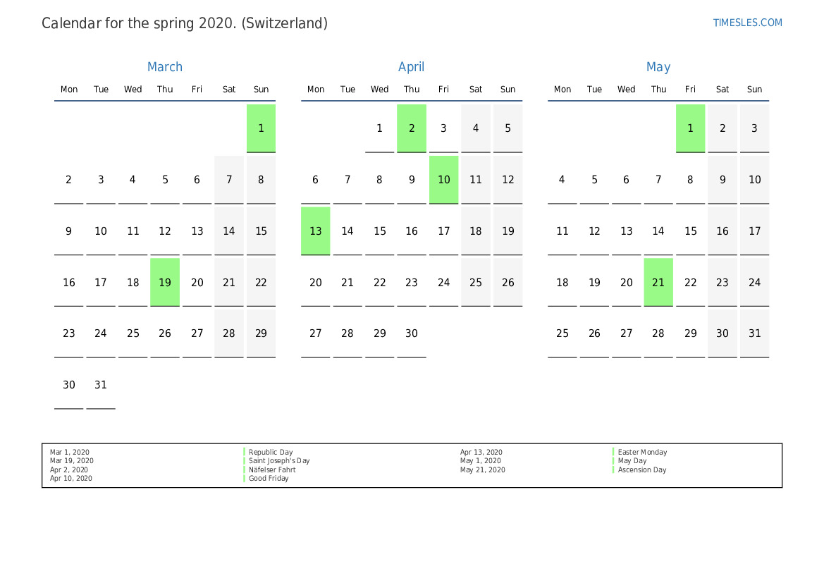 Download and print PDF calendar with holidays and weekends for the spring of 2020 for Switzerland