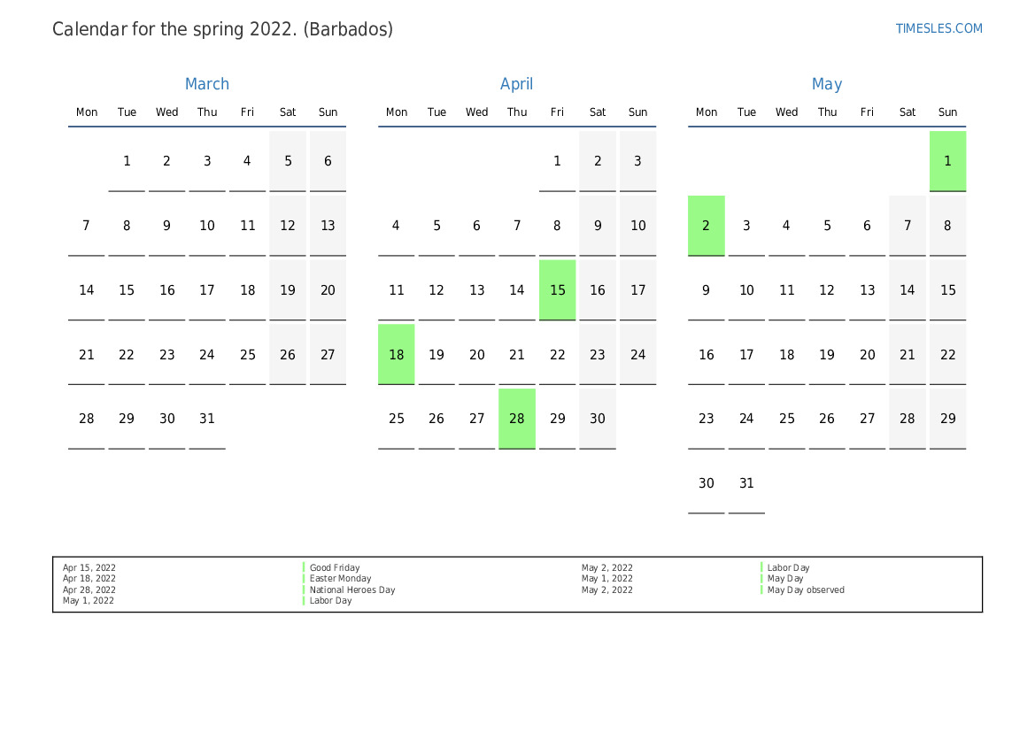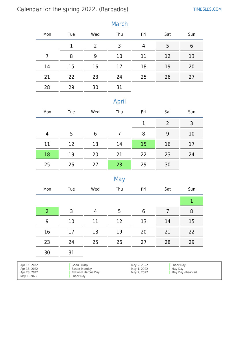 Download and print PDF calendar with holidays and weekends for the spring of 2022 for Barbados