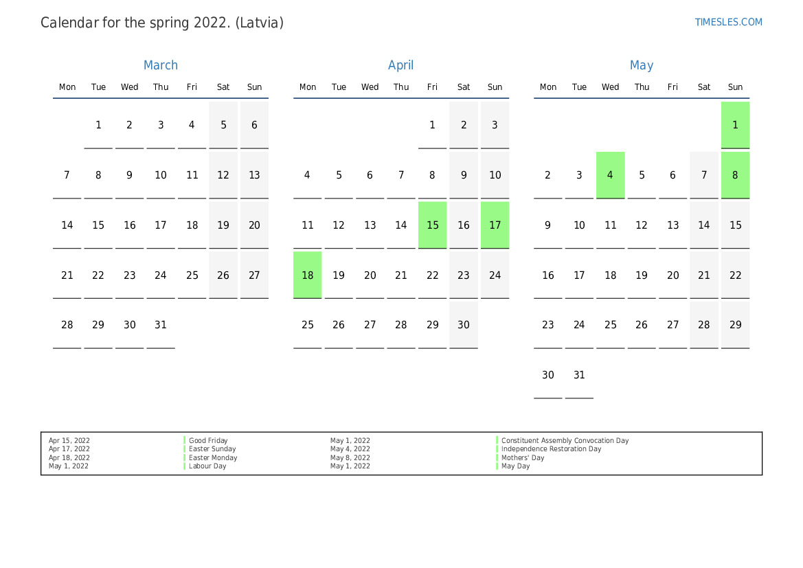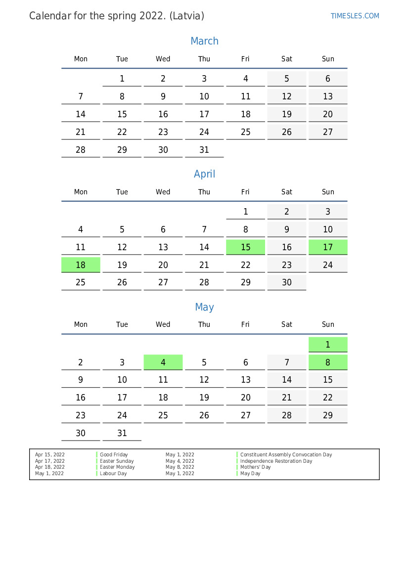 In the spring of 2022, there are 11 holidays and days off in Latvia. Spring 2022 starts on Tuesday and ends on Tuesday.