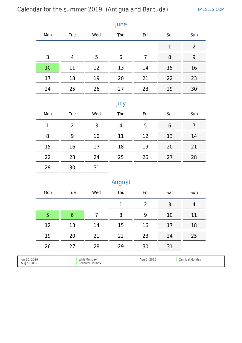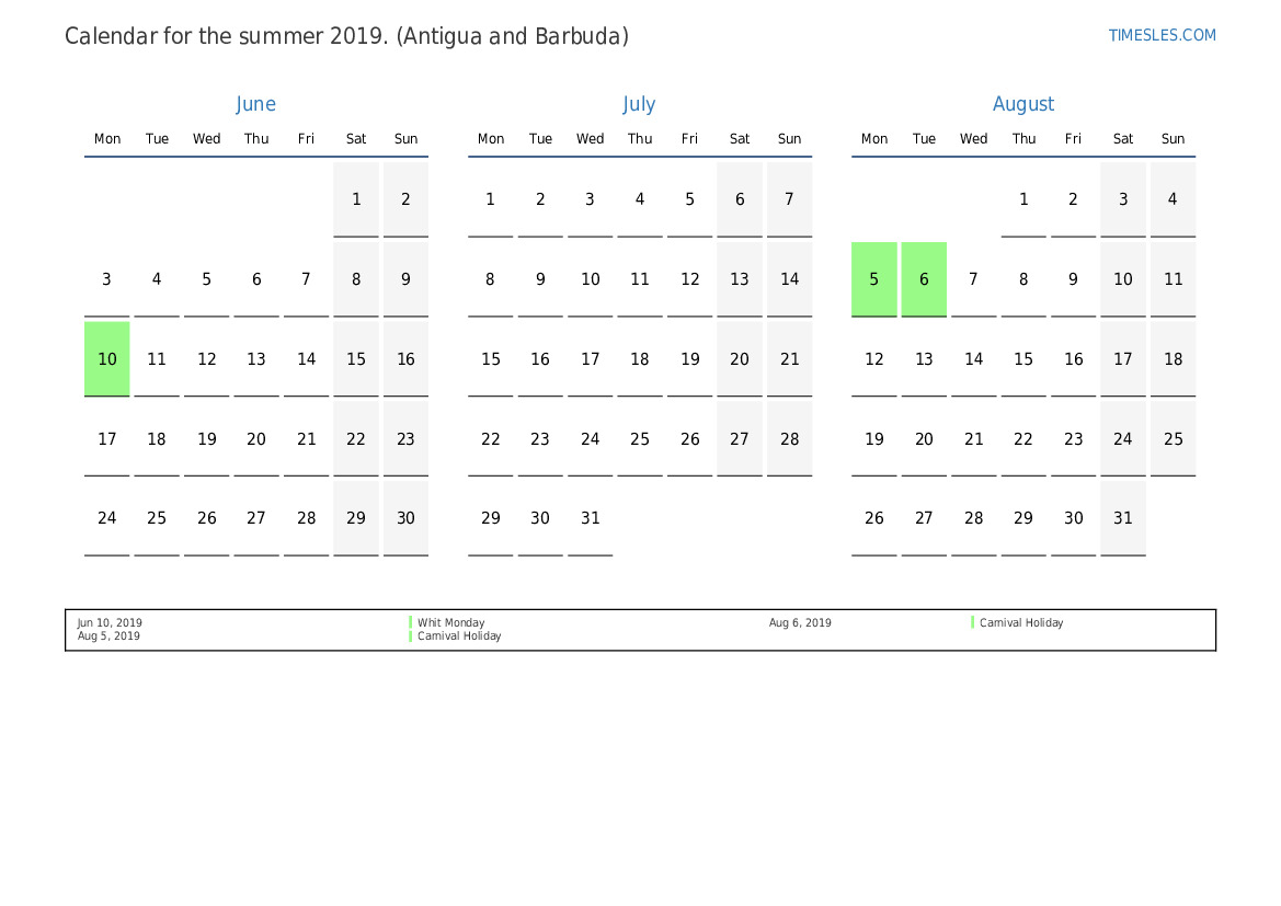 Summer calendar 2019 for Antigua and Barbuda