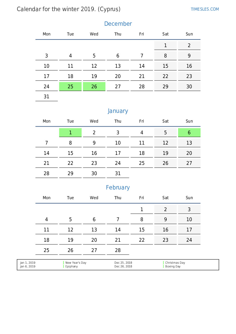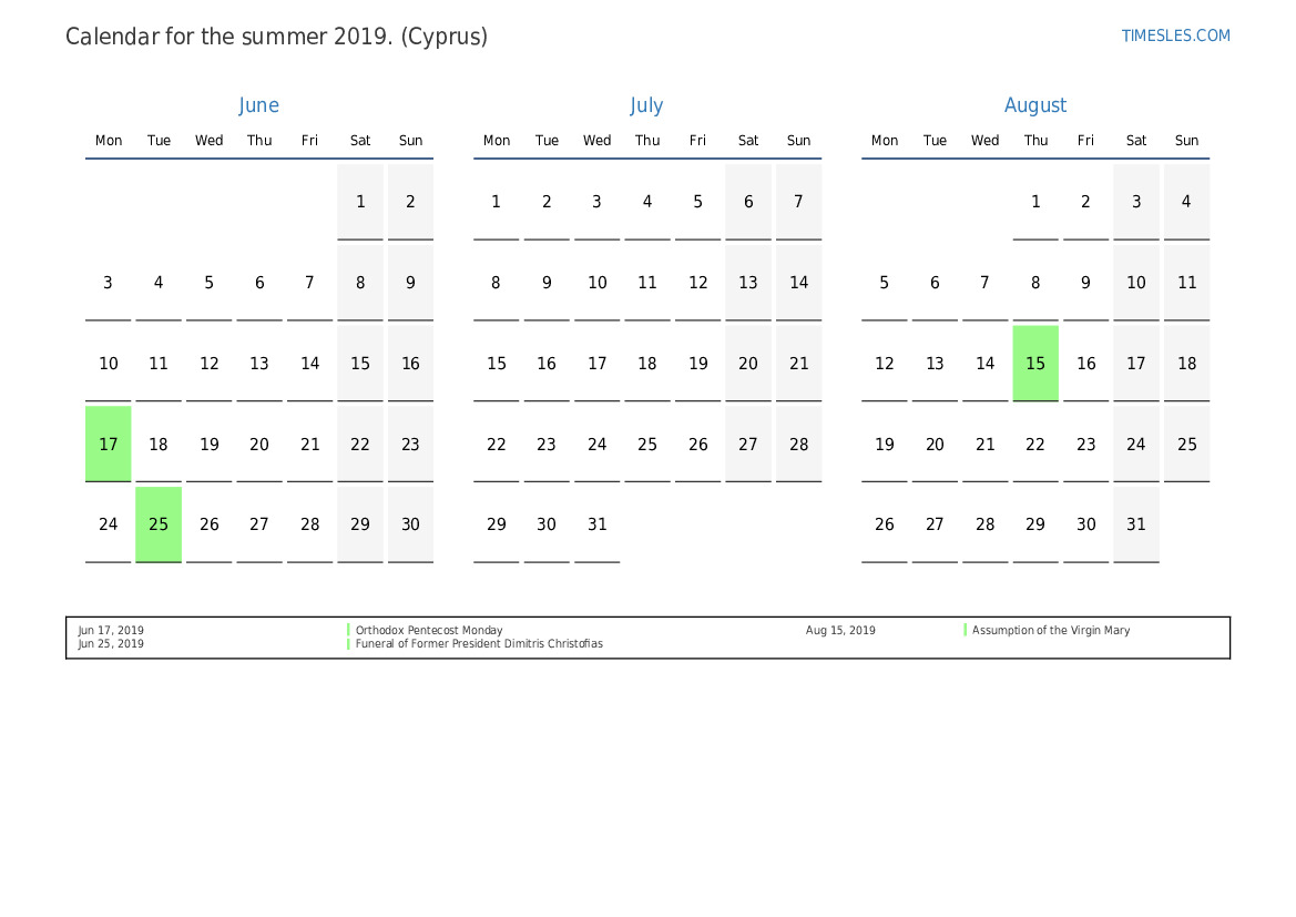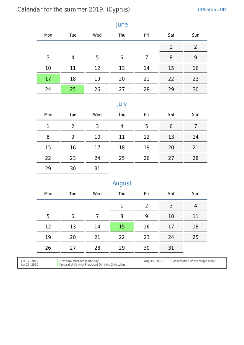 Calendar of holidays and weekends for the summer of 2019 for Cyprus