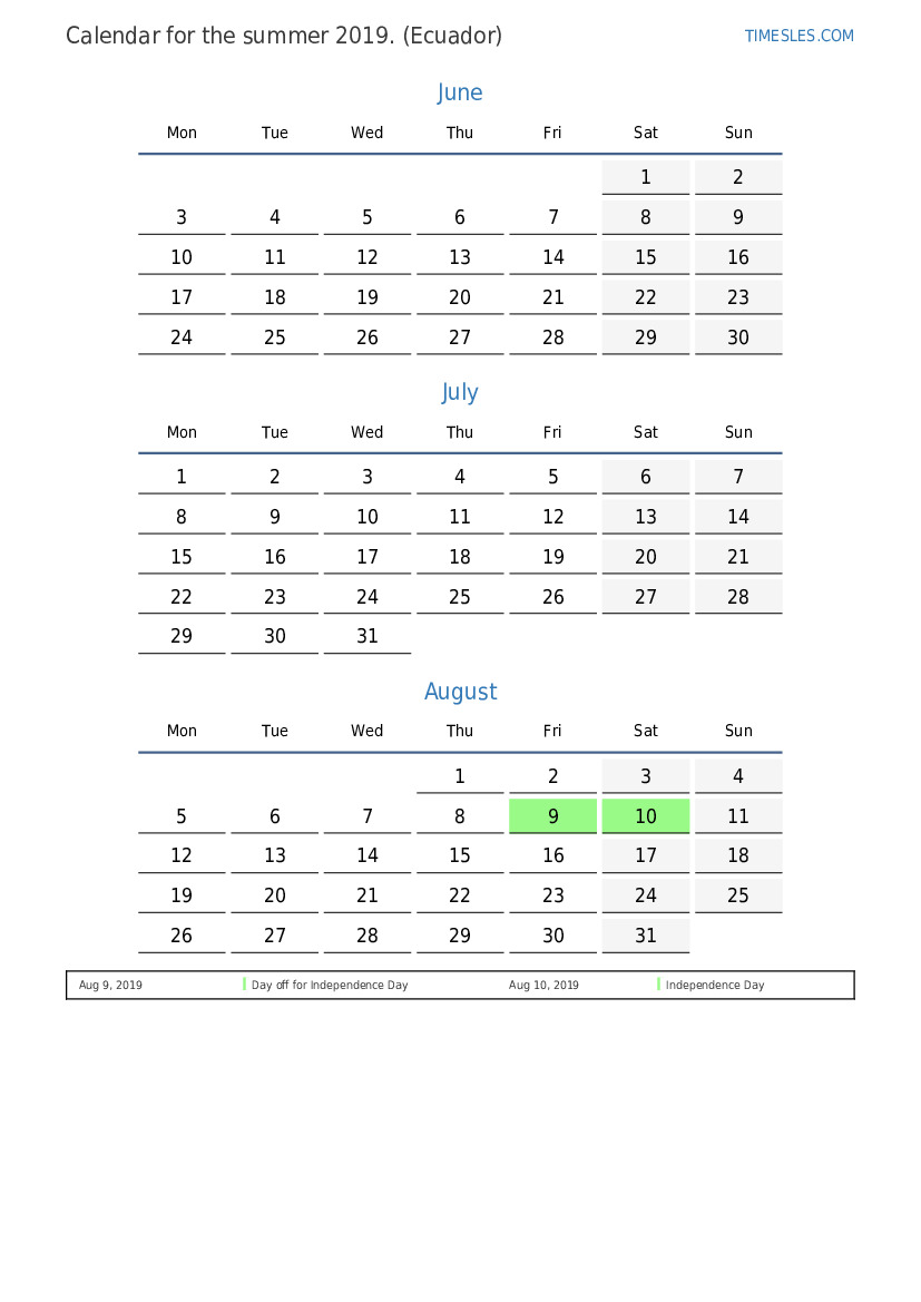 Calendar of holidays and weekends for the summer of 2019 for Ecuador