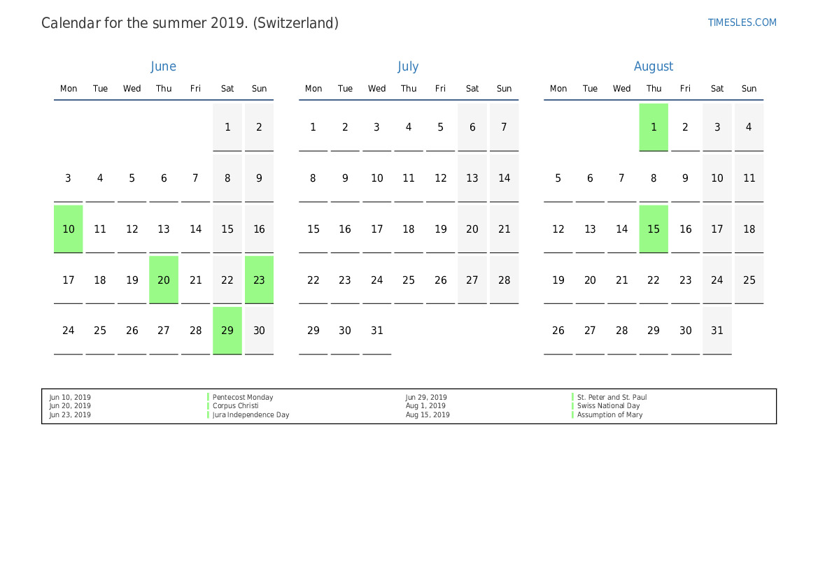Calendar of holidays and weekends for the summer of 2019 for Switzerland