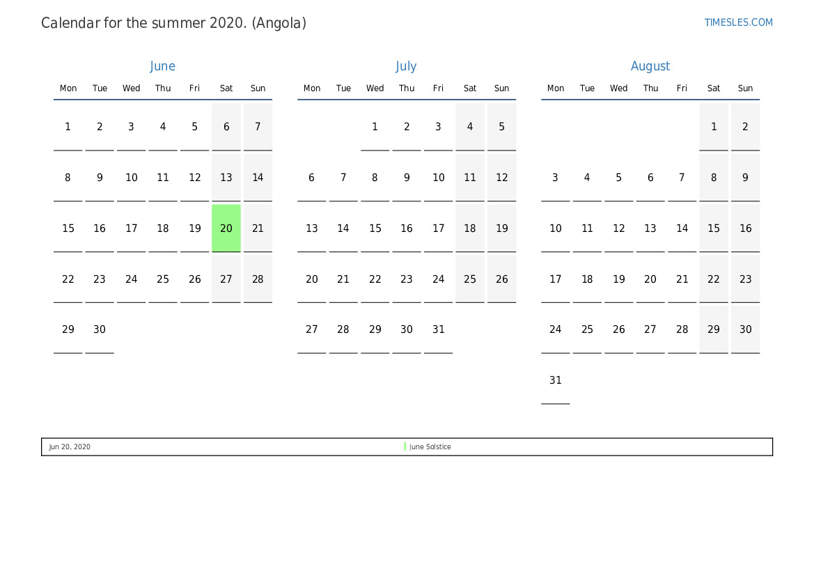 Download and print PDF calendar with holidays and weekends for the summer of 2020 for Angola