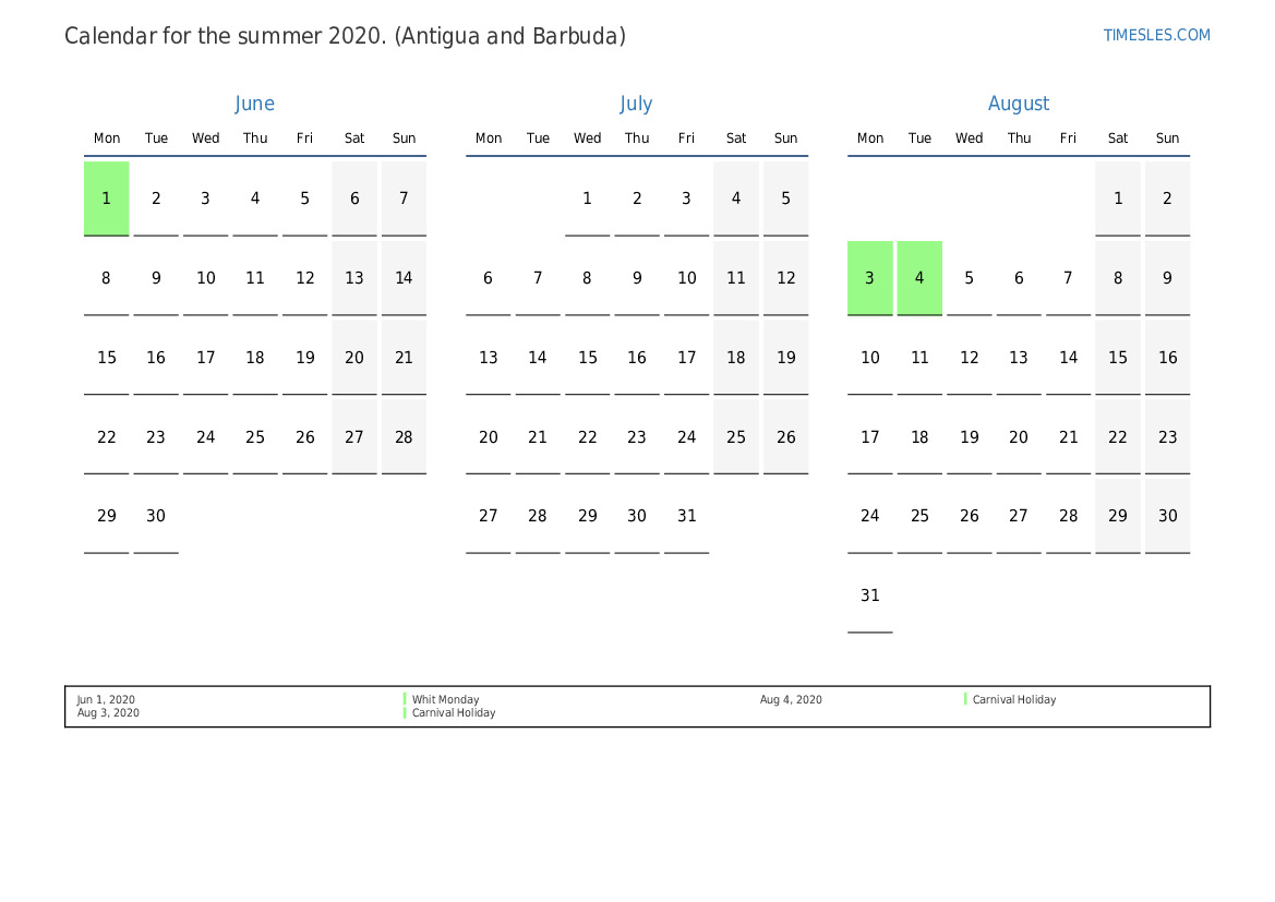 Calendar of holidays and weekends for the summer of 2020 for Antigua and Barbuda