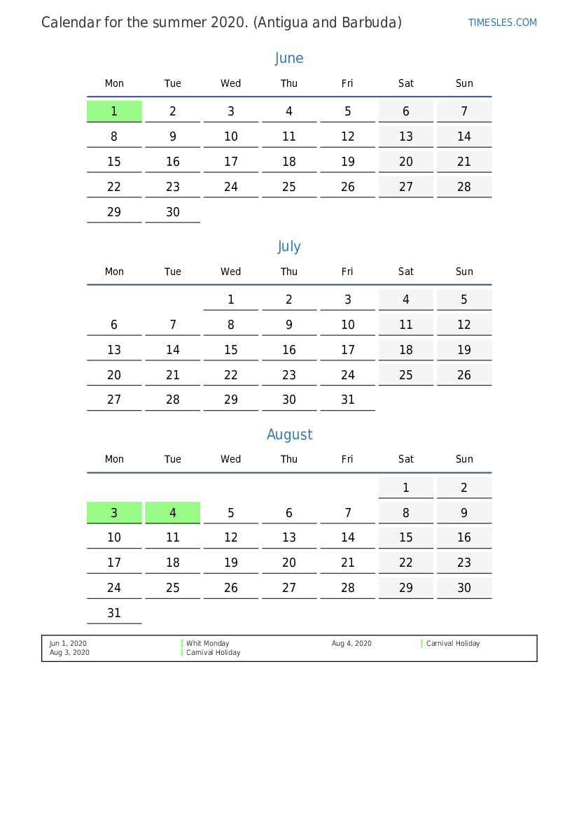 Download and print PDF calendar with holidays and weekends for the summer of 2020 for Antigua and Barbuda
