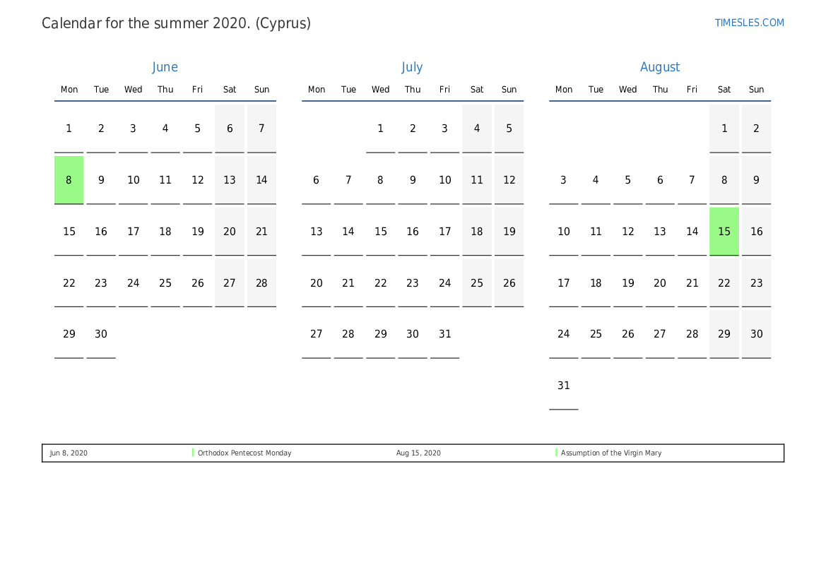 Calendar of holidays and weekends for the summer of 2020 for Cyprus