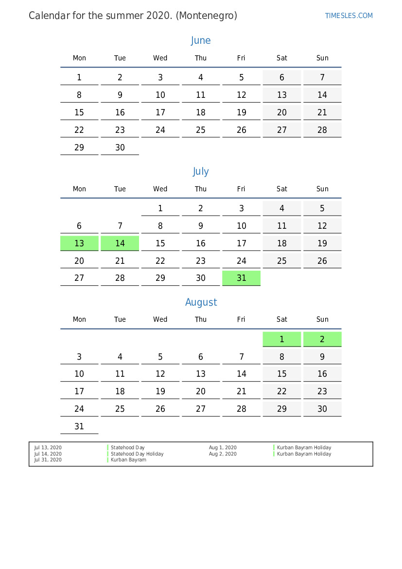 In the summer of 2020, there are 6 holidays and days off in Montenegro. Summer 2020 starts on Monday and ends on Monday.