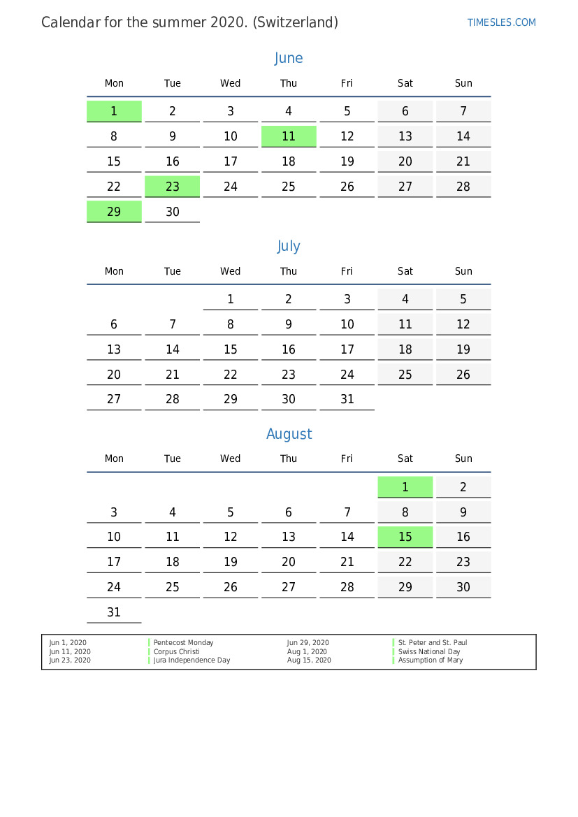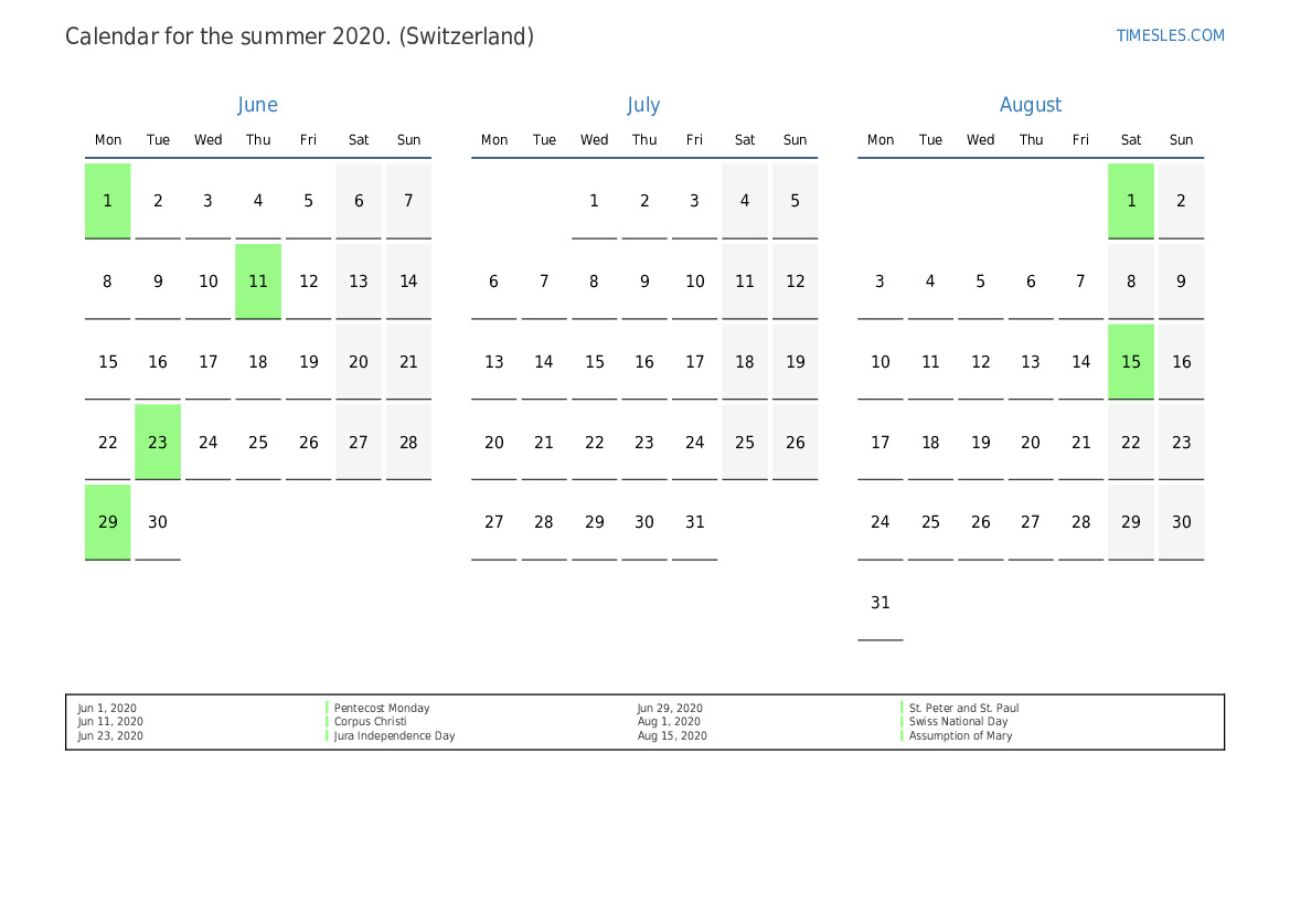 Calendar of holidays and weekends for the summer of 2020 for Switzerland
