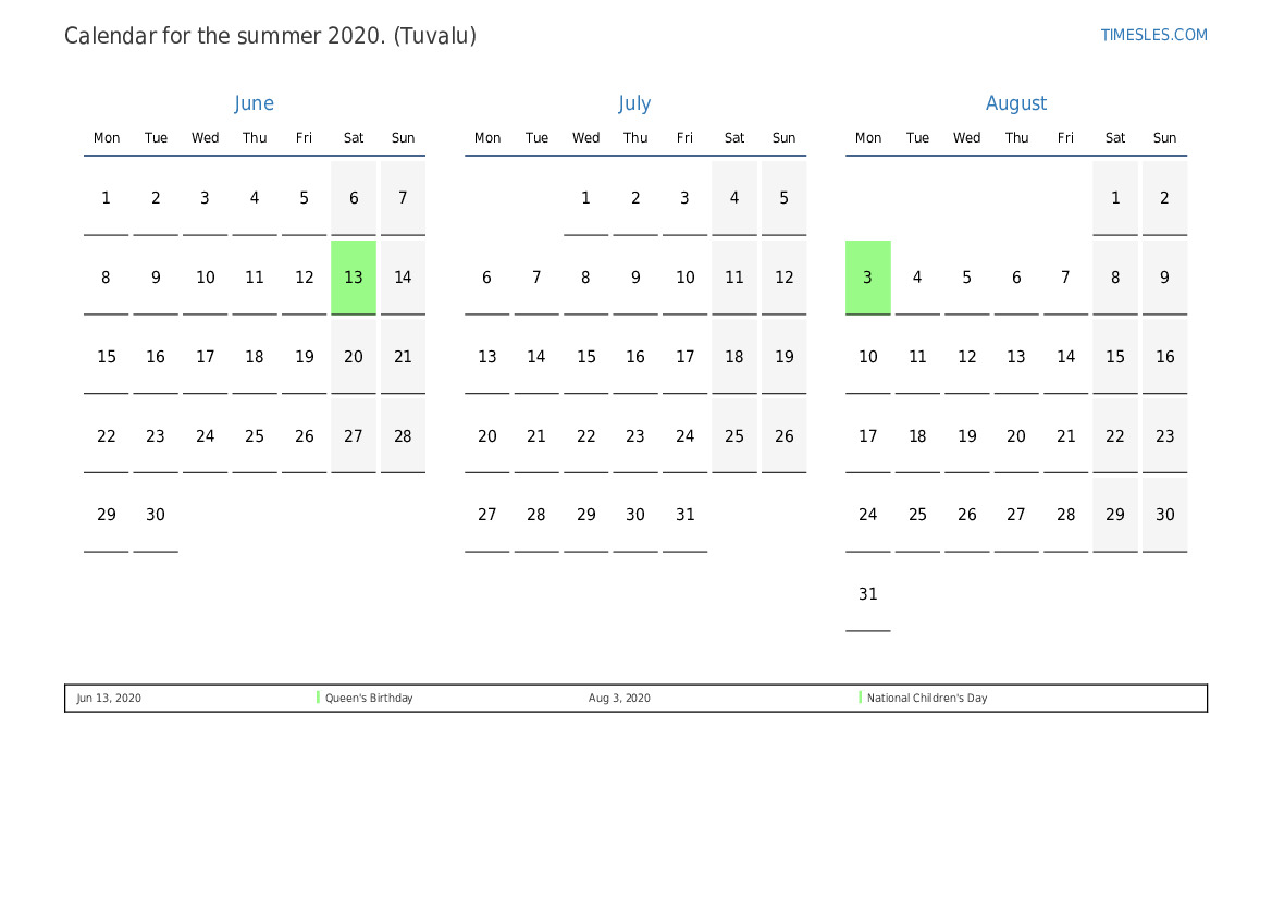 Calendar of holidays and weekends for the summer of 2020 for Tuvalu