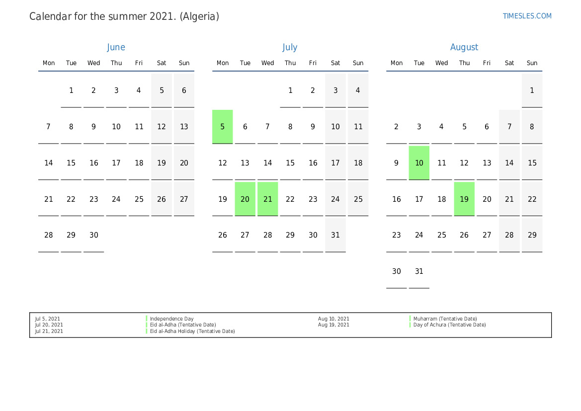 Download and print PDF calendar with holidays and weekends for the summer of 2021 for Algeria