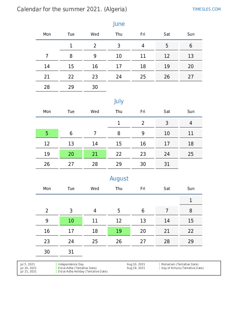 In the summer of 2021, there are 6 holidays and days off in Algeria. Summer 2021 starts on Tuesday and ends on Tuesday.