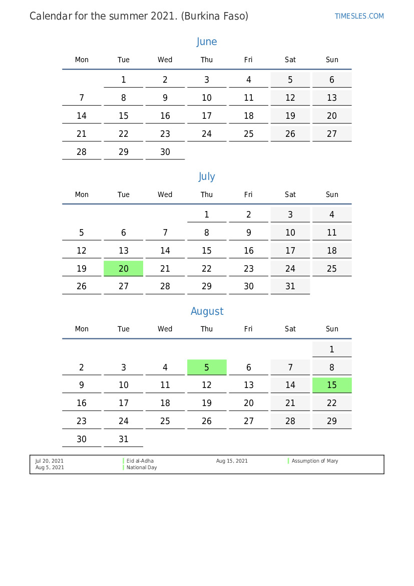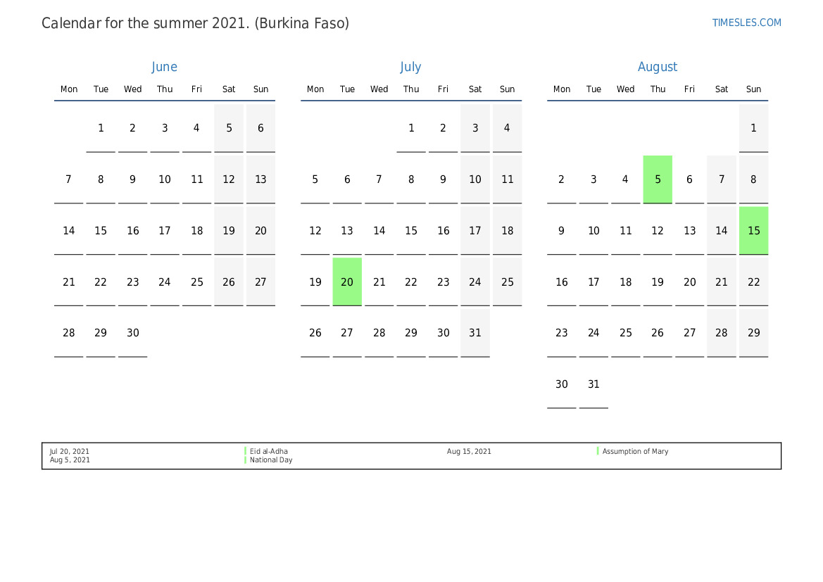 Summer calendar 2021 for Burkina Faso