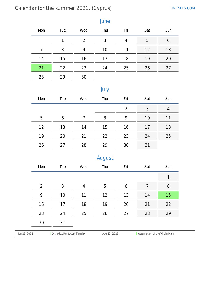 Calendar of holidays and weekends for the summer of 2021 for Cyprus