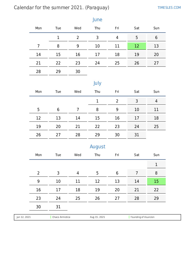 In the summer of 2021, there are 3 holidays and days off in Paraguay. Summer 2021 starts on Tuesday and ends on Tuesday.