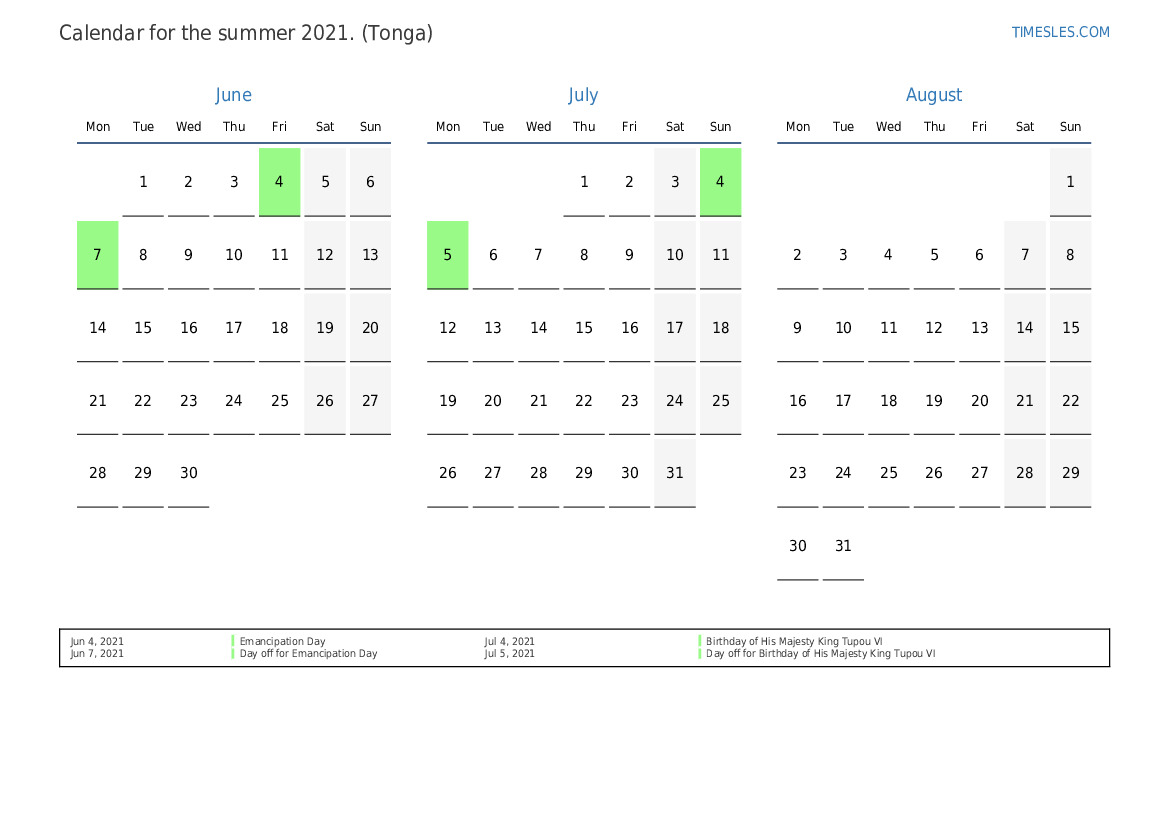 Calendar of holidays and weekends for the summer of 2021 for Tonga
