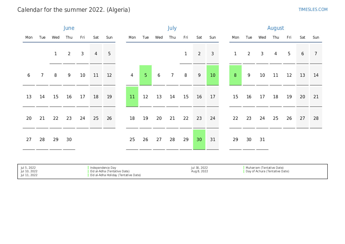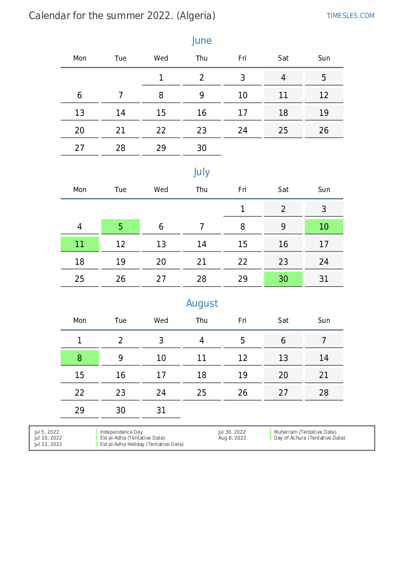 In the summer of 2022, there are 6 holidays and days off in Algeria. Summer 2022 starts on Wednesday and ends on Wednesday.