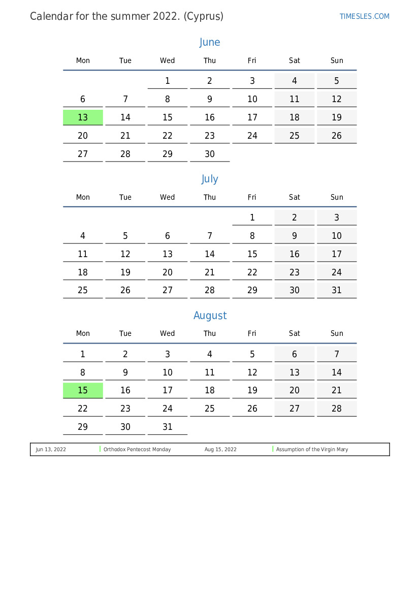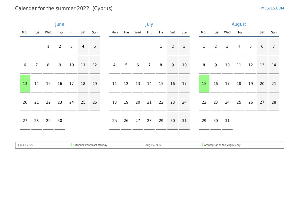 Calendar of holidays and weekends for the summer of 2022 for Cyprus