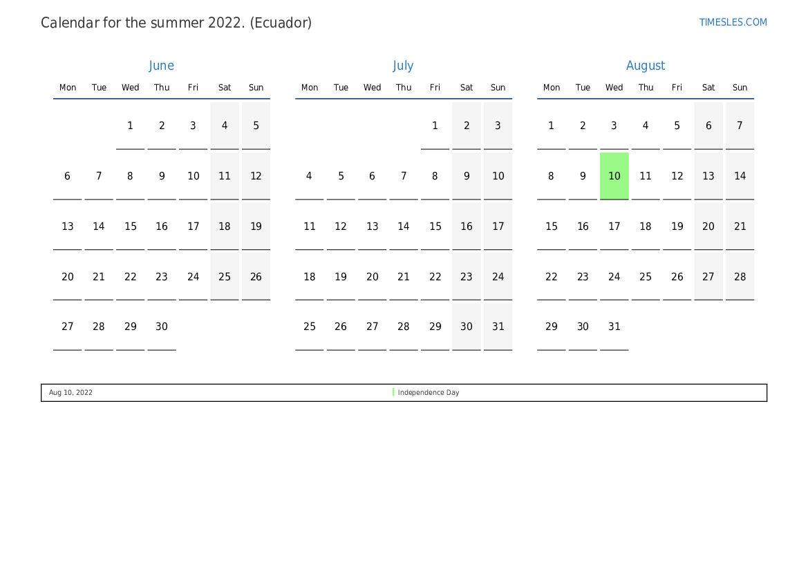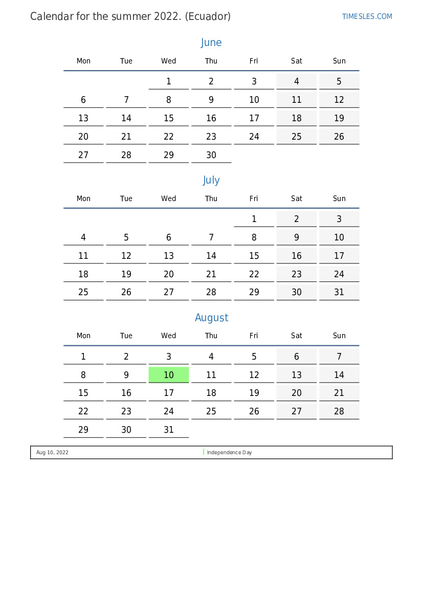 In the summer of 2022, there are 3 holidays and days off in Ecuador. Summer 2022 starts on Wednesday and ends on Wednesday.