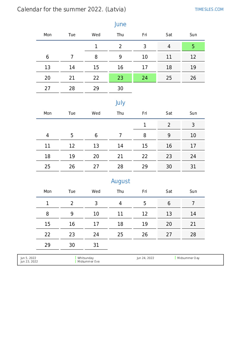 In the summer of 2022, there are 4 holidays and days off in Latvia. Summer 2022 starts on Wednesday and ends on Wednesday.