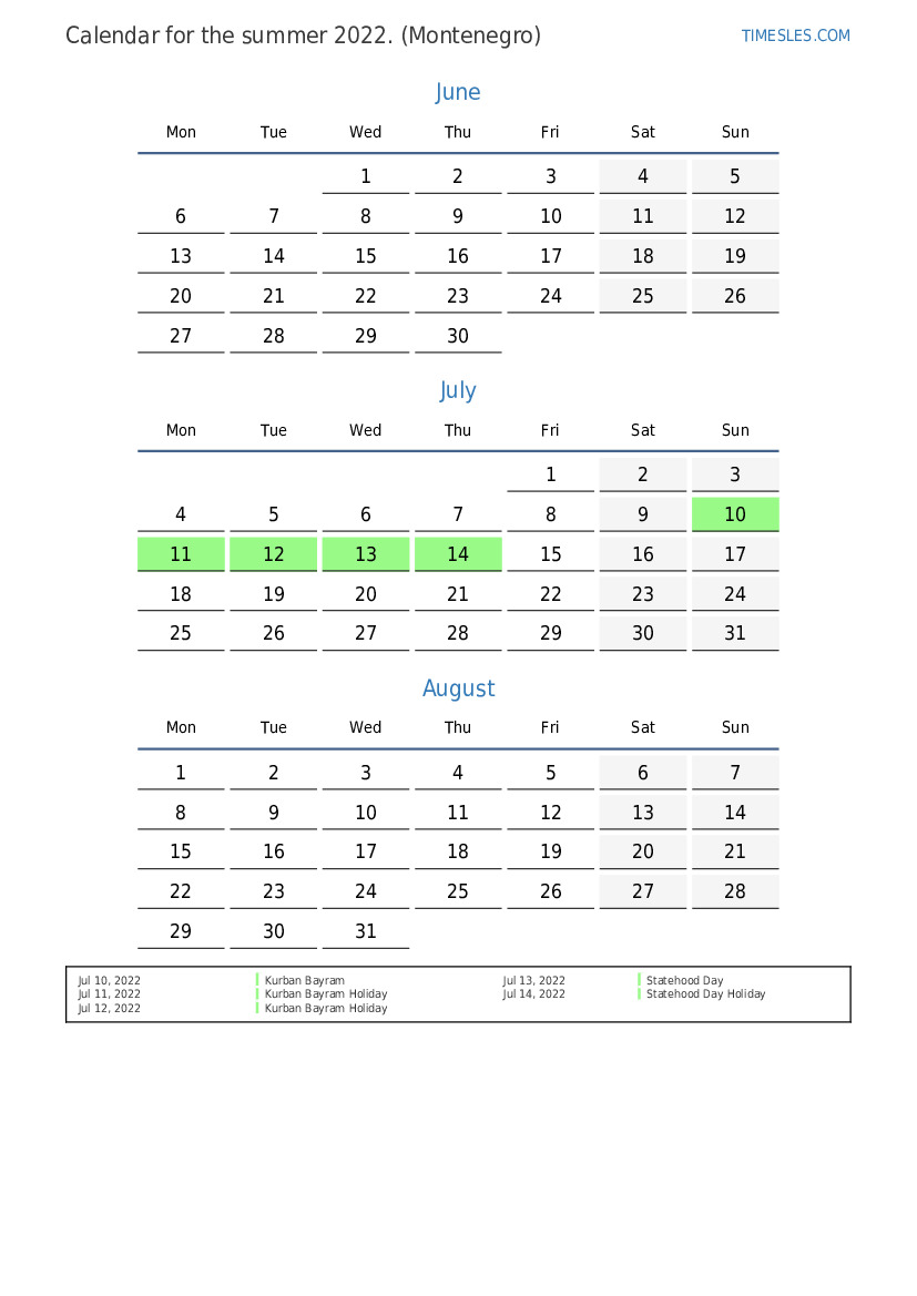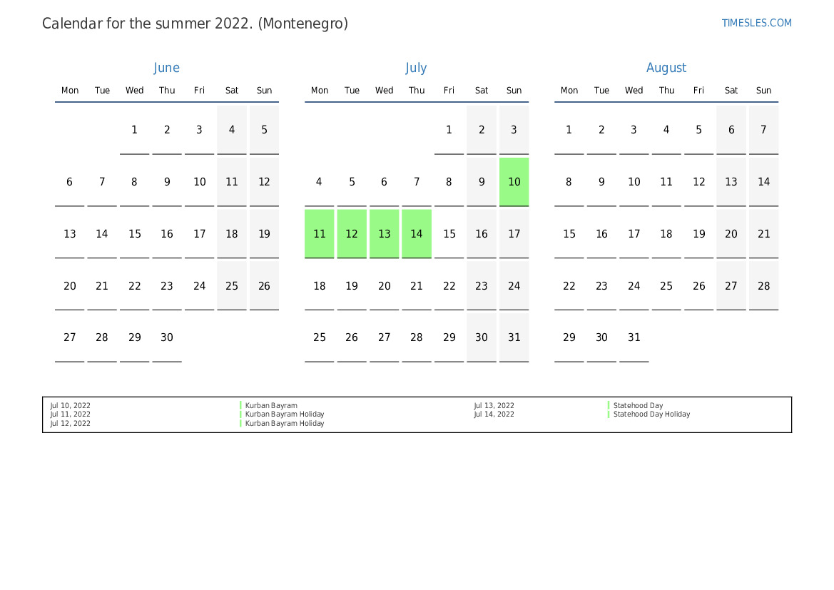 Calendar of holidays and weekends for the summer of 2022 for Montenegro