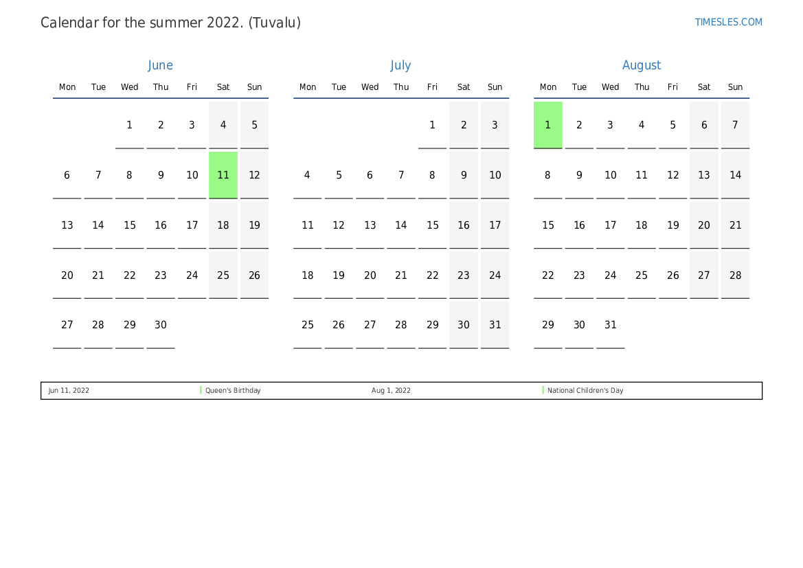 In the summer of 2022, there are 3 holidays and days off in Tuvalu. Summer 2022 starts on Wednesday and ends on Wednesday.