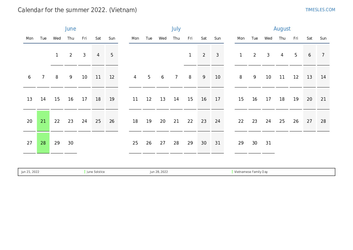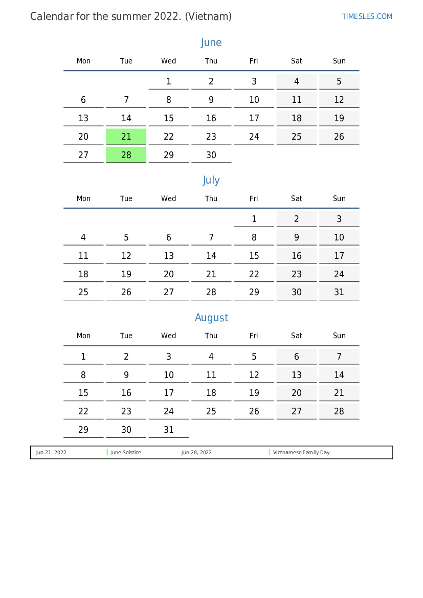In the summer of 2022, there are 2 holidays and days off in Vietnam. Summer 2022 starts on Wednesday and ends on Wednesday.