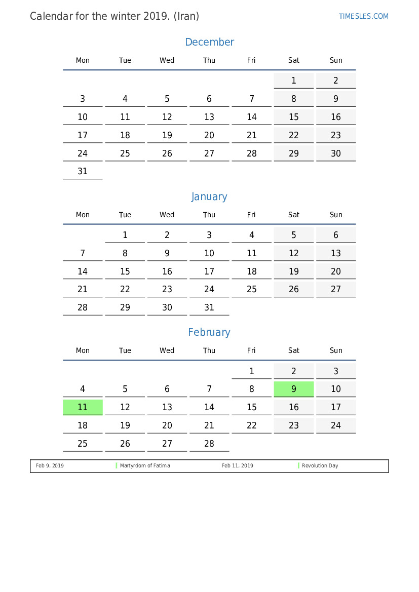 In the winter of 2019, there are 3 holidays and days off in Iran. Winter 2019 starts on Saturday and ends on Thursday.