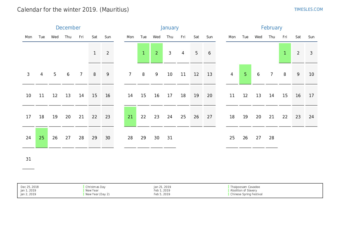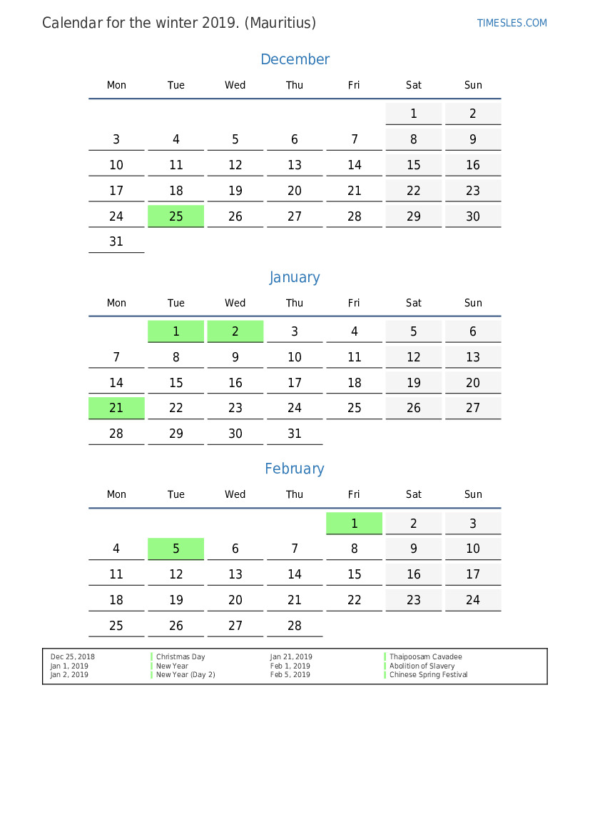 Download and print PDF calendar with holidays and weekends for the winter of 2019 for Mauritius
