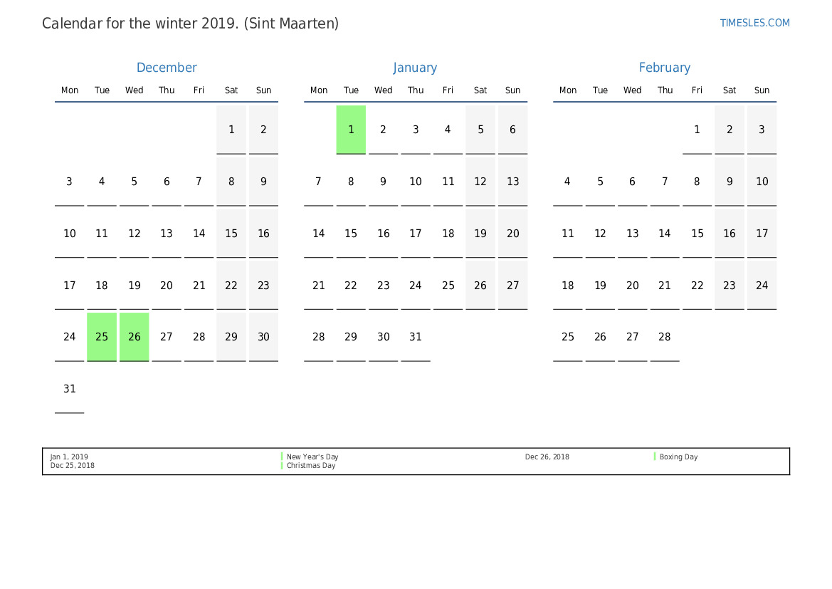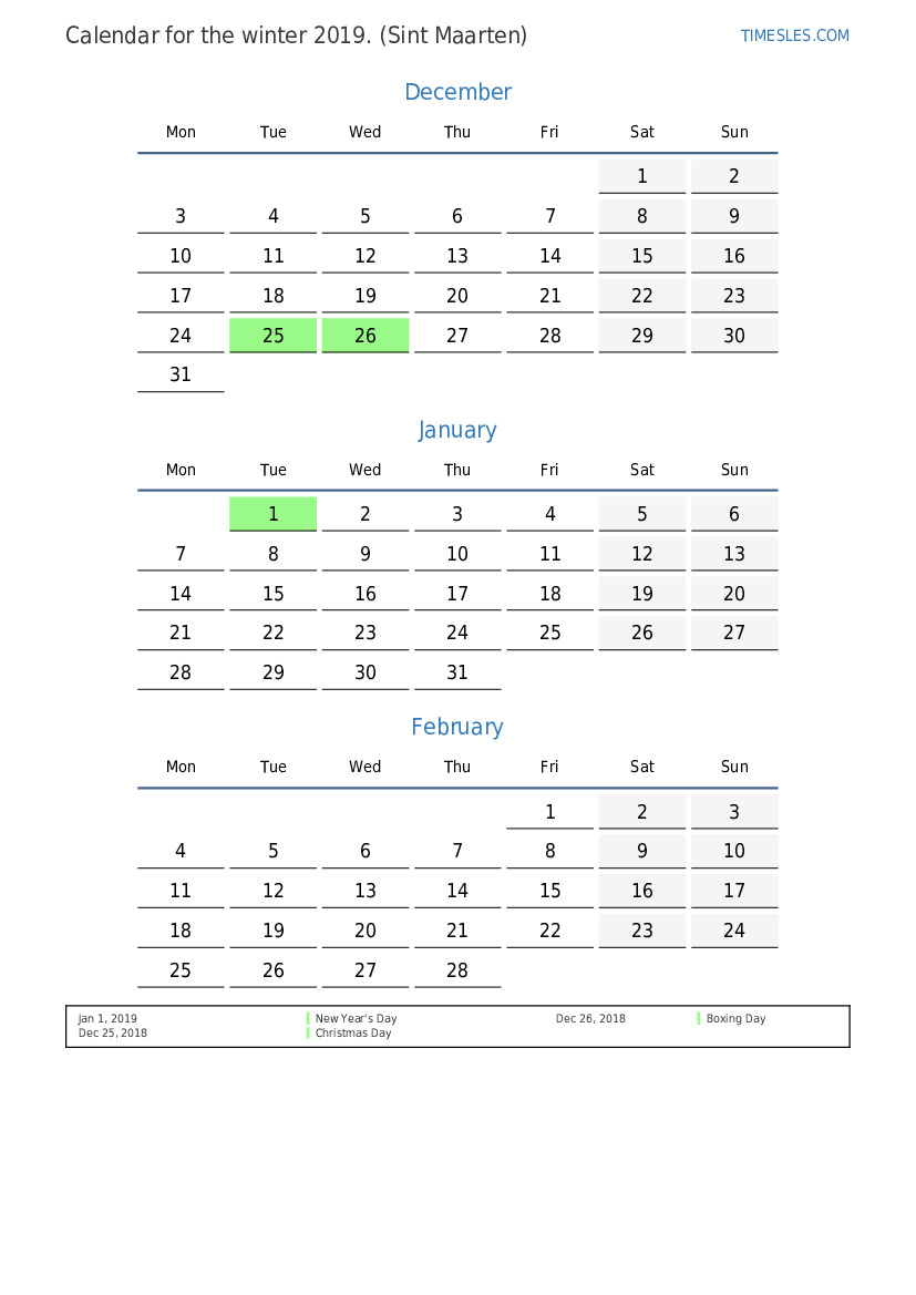 Download and print PDF calendar with holidays and weekends for the winter of 2019 for Sint Maarten