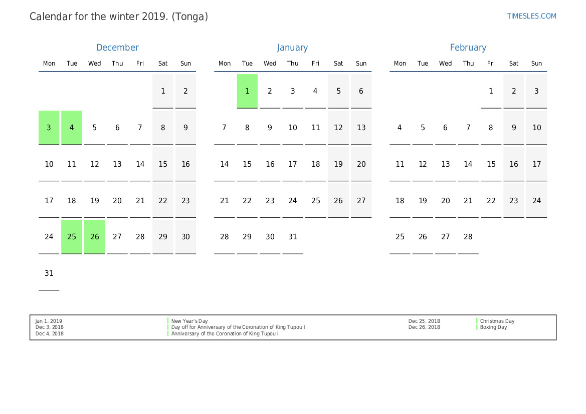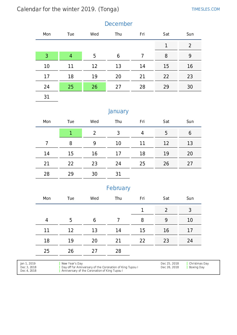 Calendar of holidays and weekends for the winter of 2019 for Tonga