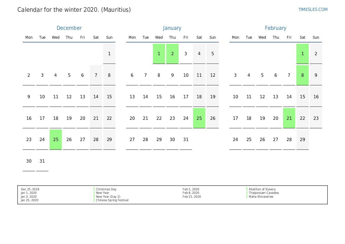 Download and print PDF calendar with holidays and weekends for the winter of 2020 for Mauritius