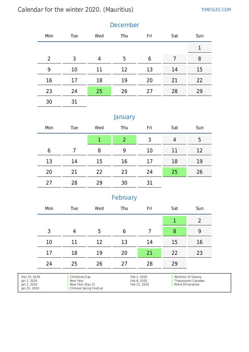 Calendar of holidays and weekends for the winter of 2020 for Mauritius